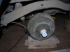 Nejdříve jsem sundal kolo a potom jako první tlumič. Pak jsem si připravil špalky na opření rámu vzadu, aby si to mělo na co sednout až uvolním nápravu od pérování. Pak jsem podložil nápravu pod bubnem prkénky, aby bylo níž až se listy napruží. Pak už jen zbývalo povolit matky ze čtyřech U-šroubů, které obepínají nápravu.
